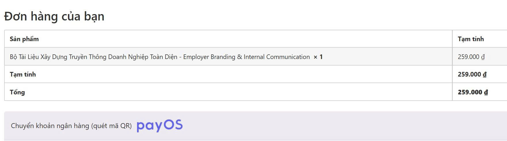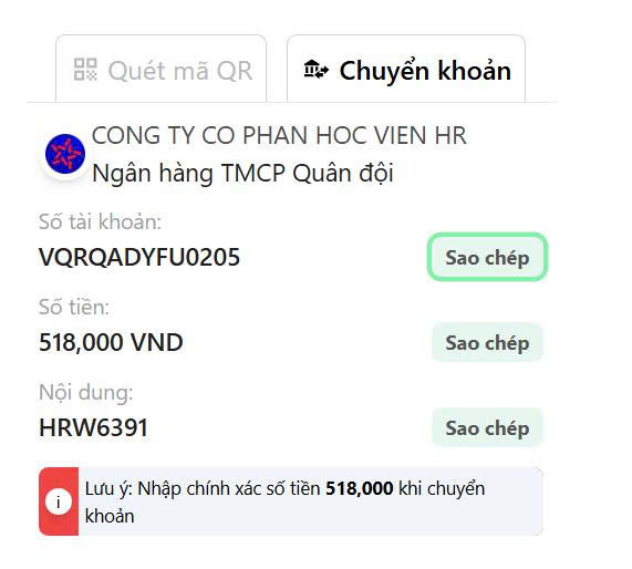 Website hocvienhr.com áp dụng phương thức thanh toán chuyển khoản ngân hàng qua mã QR tích hợp hệ thống PayOS.