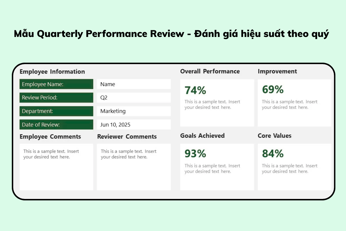 Quarterly Performance Review là quá trình đánh giá định kỳ sau mỗi ba tháng về hiệu suất làm việc của nhân viên — bao gồm mức độ hoàn thành công việc, chất lượng, năng suất, kỹ năng, thái độ,… Mục đích không chỉ để đo lường mà còn để hỗ trợ phát triển nhân viên, điều chỉnh chiến lược công việc và mục tiêu phù hợp với thực tế môi trường thay đổi nhanh.